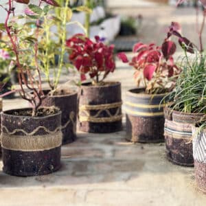 Made of recycled geotextile from waste plastic bottles and cloth fibres, we aim to reduce plastic pollution and also target global warming at the same time by growing plants in these.